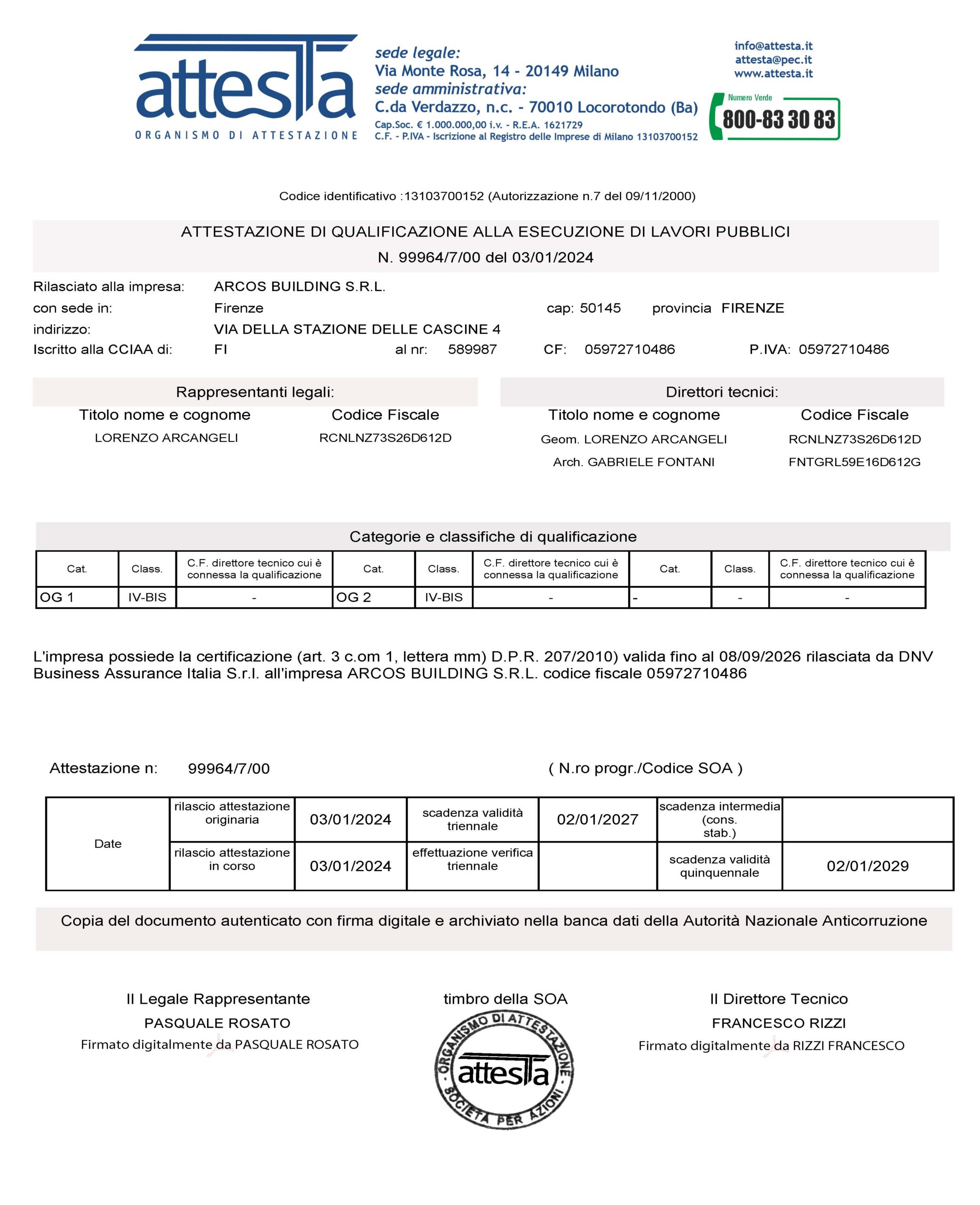 L’edilizia è probabilmente uno dei campi lavorativi nel quale avere determinate certificazioni porta a vantaggi o svantaggi, a seconda dei casi. Arcos Building Srl ad oggi è certificata SOA OG1 IV° Bis e OG2 IV° Bis – Certificata ISO 9001 DNV GL Business e certificata ISO 45001:2018 (sistema per la salute e sicurezza sul lavoro)